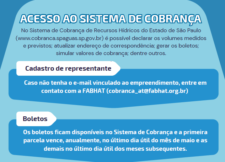 A partir de 2025, os boletos da cobrança serão disponibilizados apenas no Sistema de Cobrança de Recursos Hídricos do Estado de São Paulo (https://cobranca.spaguas.sp.gov.br/).